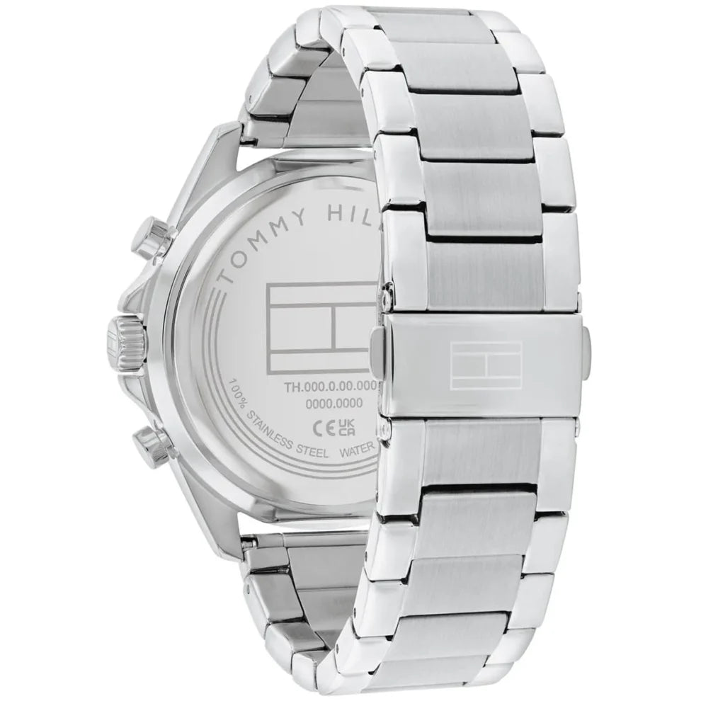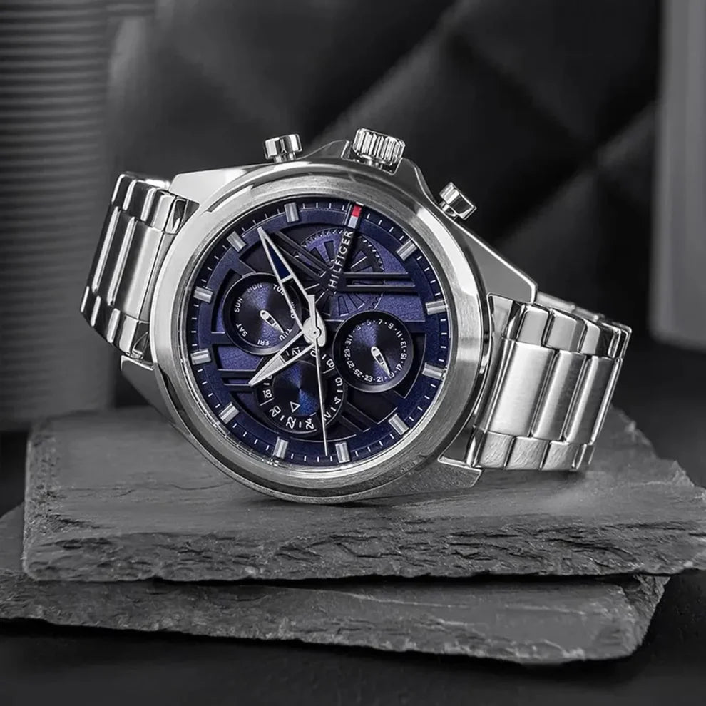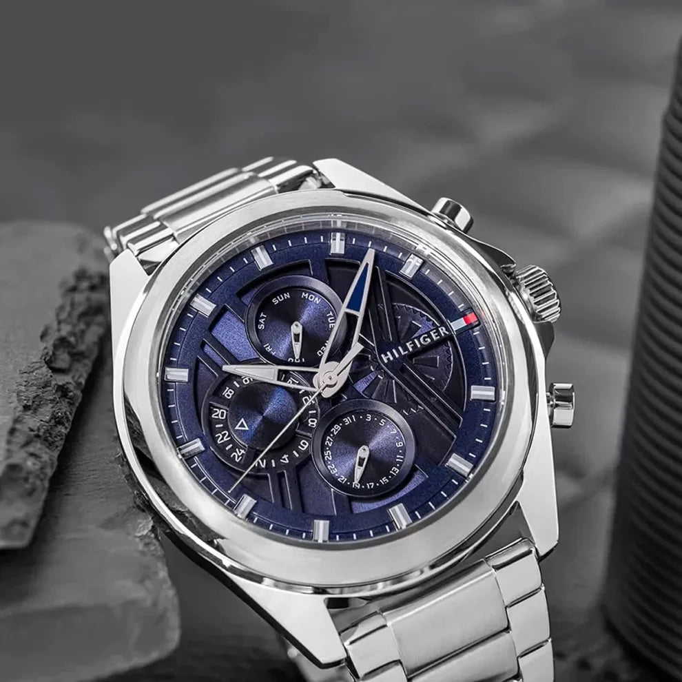 The Tommy Hilfiger men’s watch blends innovative design with craftsmanship. Featuring luxury-inspired integrated bracelets, a skeleton dial with CD-textured outer zone, and applied stick indexes, it’s a balance of style and sophistication.