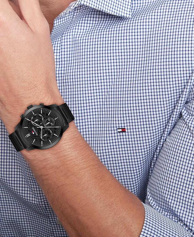Men's Tommy Hilfiger, Ionic Plated Black Steel Case, Black Dial, with Black Bracelet.